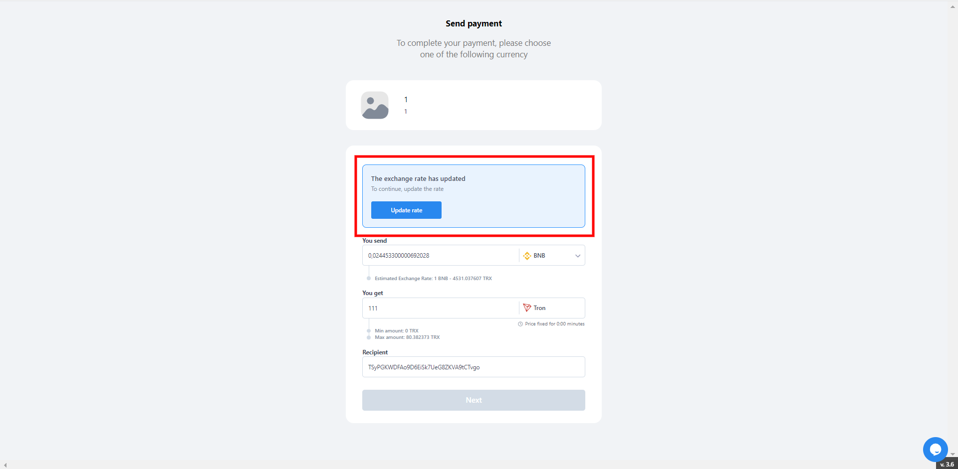If exchange rate expired, then opens the payment widget.