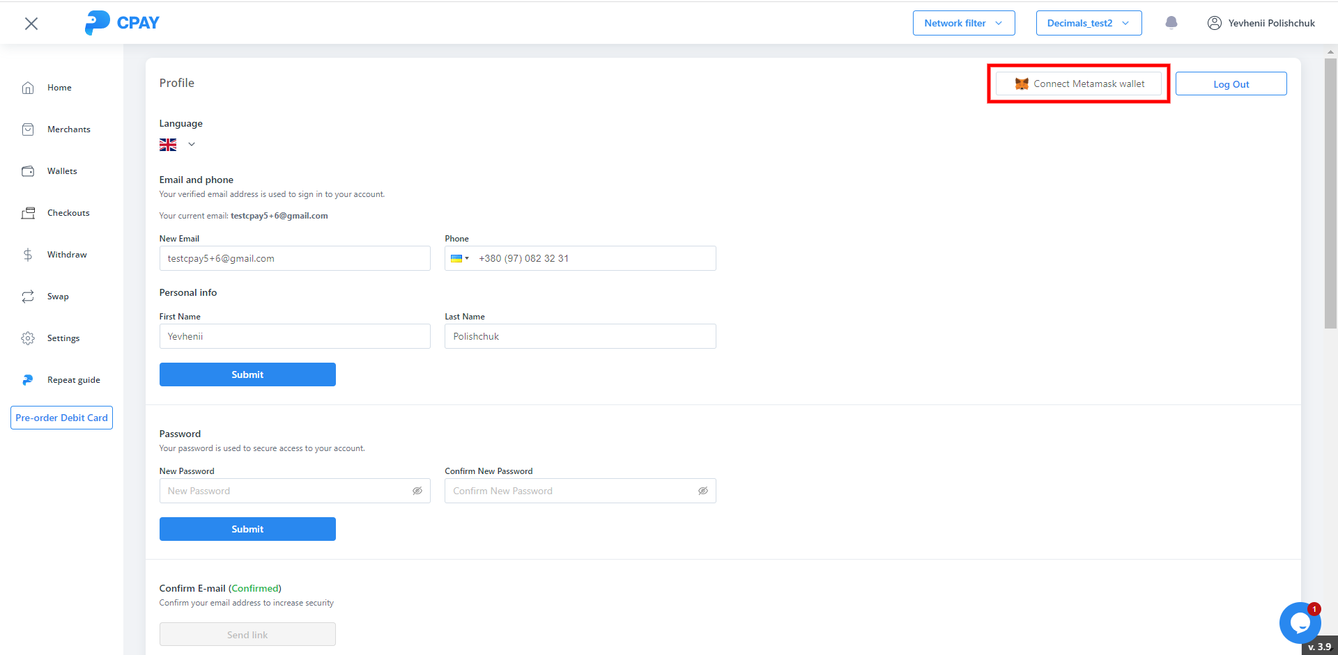 4) Added the ability to connect the Metamask wallet to account