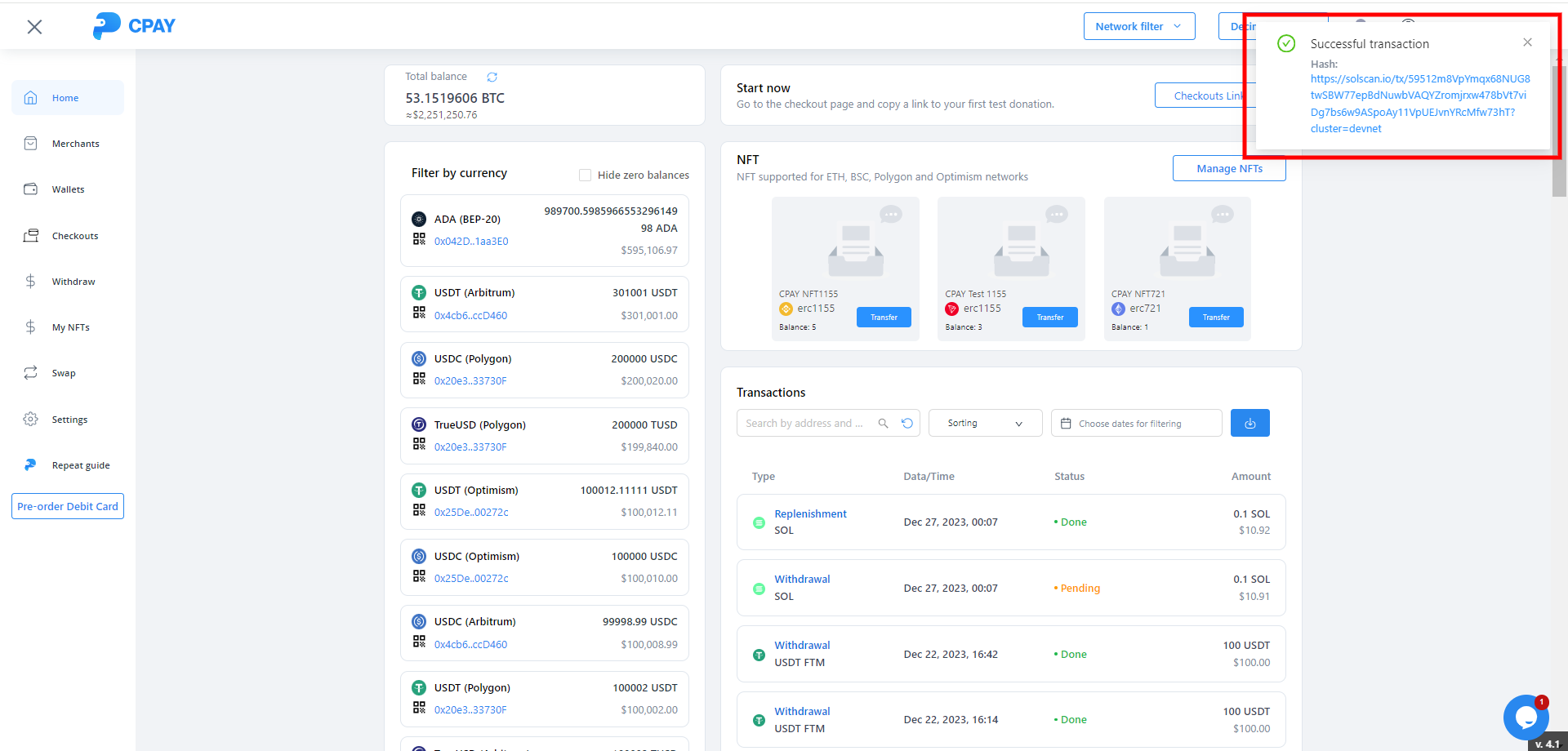 9) Added notification in the upper right corner indicating that the transaction has completed