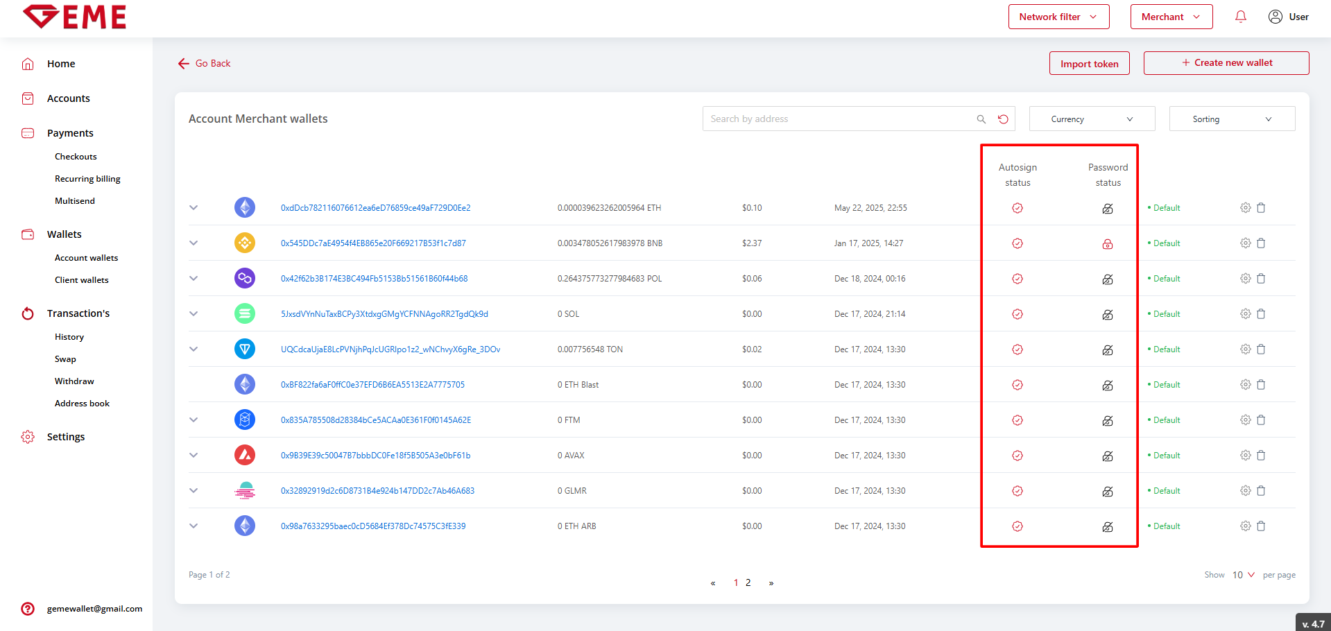 Auto-signing is enabled by default. The user sees the auto-signing status and the wallet password status (now each wallet must have its own password if the user disables auto-signing):