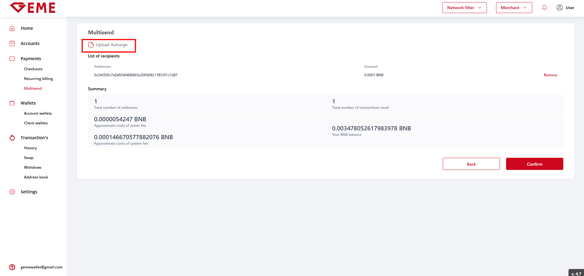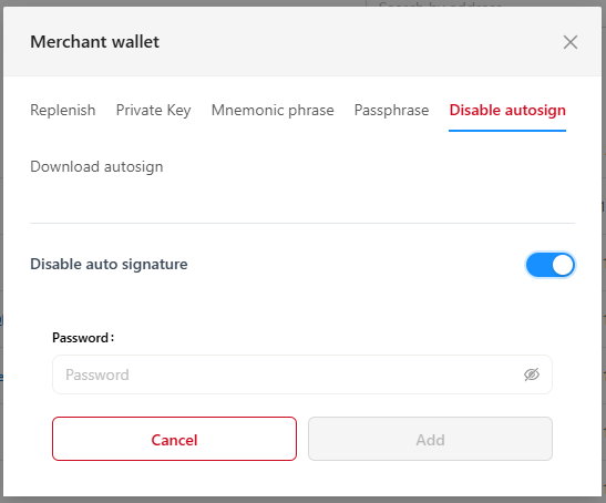 - Client wallets replenishment - a scenario similar to Checkouts(Donation, Sale, Cart). If you replenish a client wallet with auto-signing disabled, a transaction with an error will be created, after auto-signing is enabled, the transaction will be completed.