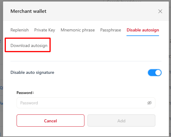 To download the right part of the private key, turn off/on auto-signing, you need to set a password for the wallet: