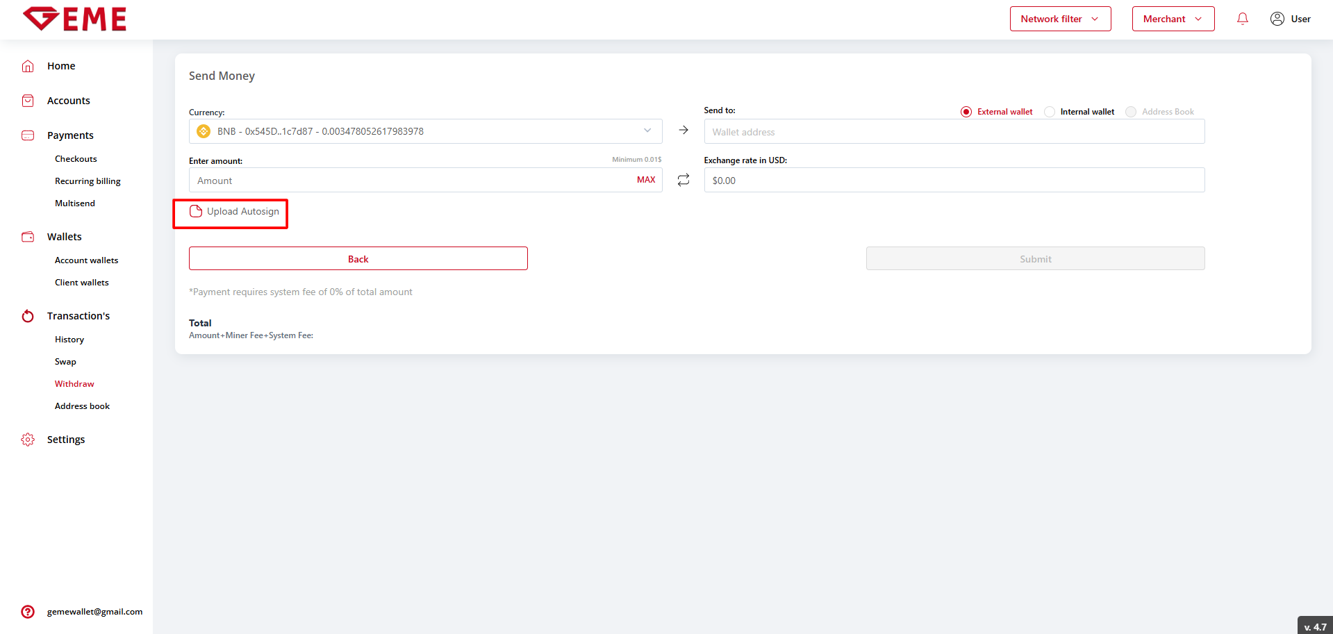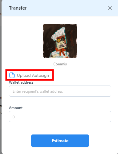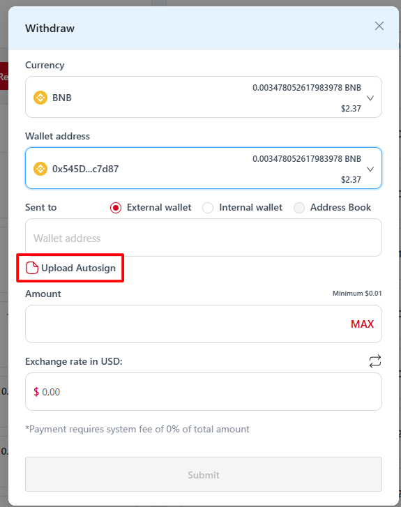 When auto-signing is disabled on the account wallet, the user must "attach" the right part of the private key in encrypted form as a txt file, enter the password for it and successfully pass all activated authentication methods (E-mail 2FA, Two-factor authentication, Phone 2FA) for the following functions: