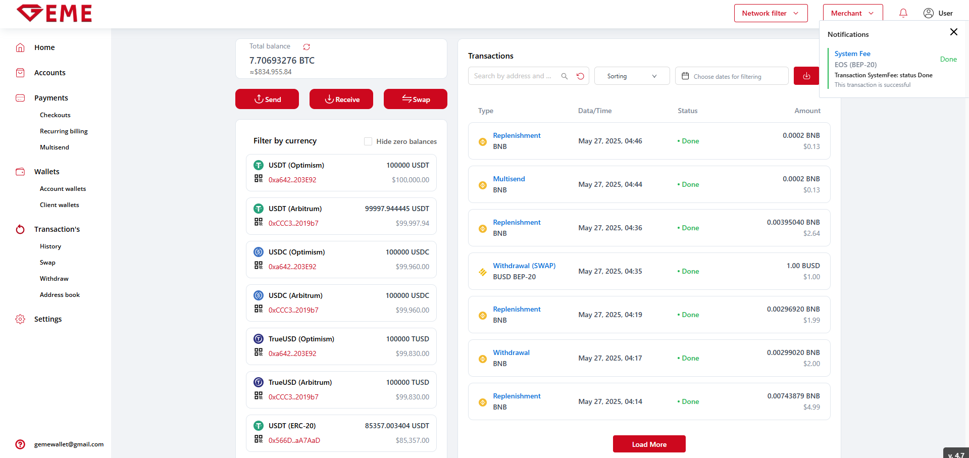 - Transitions notifications: Replenishment-Waiting for funds, System Fee - Error/Done, Refund-New: