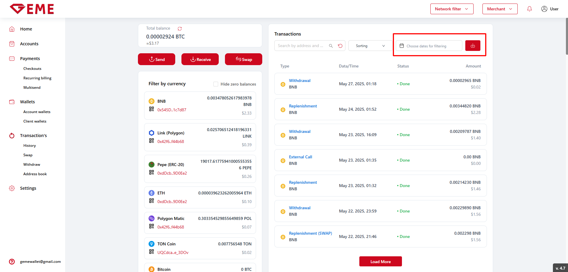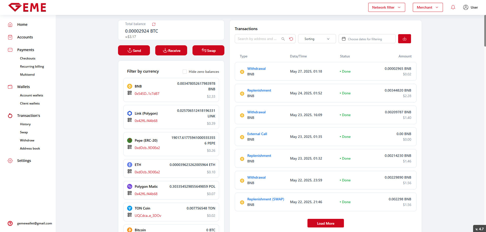 Transactions - a list of all transactions within the selected account. There are four types of transactions in GEME:
