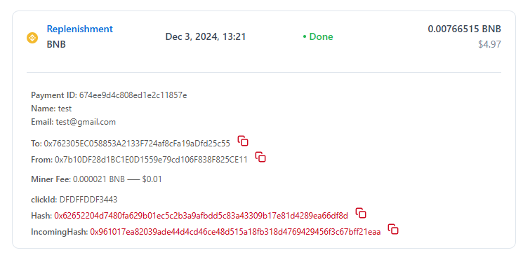- IncomingHash - transaction hash of replenishment of the account's client wallet.