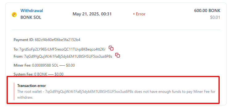 If the transaction fails for any reason, the user will see a notification with the reason for the failure: