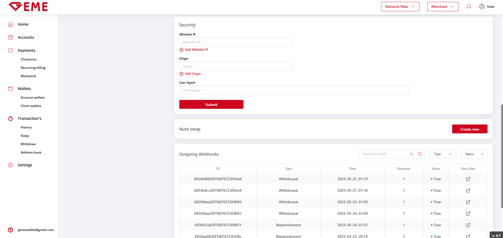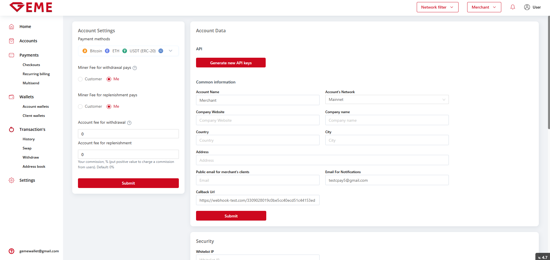 Email For Notifications - Email for sending transaction notifications: Refund - New, Replenishment - Waiting for funds, System Fee - Error.