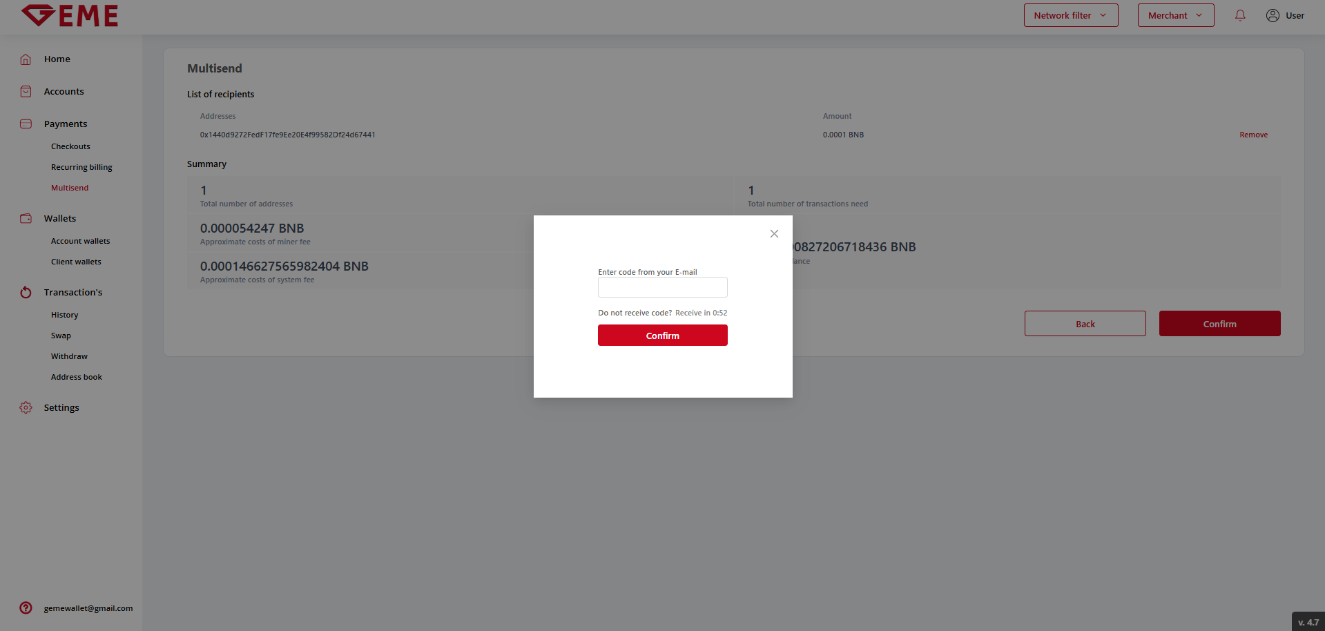 Clicking to the Next button estimates the System Fee, approves multisend and estimates Miner Fee