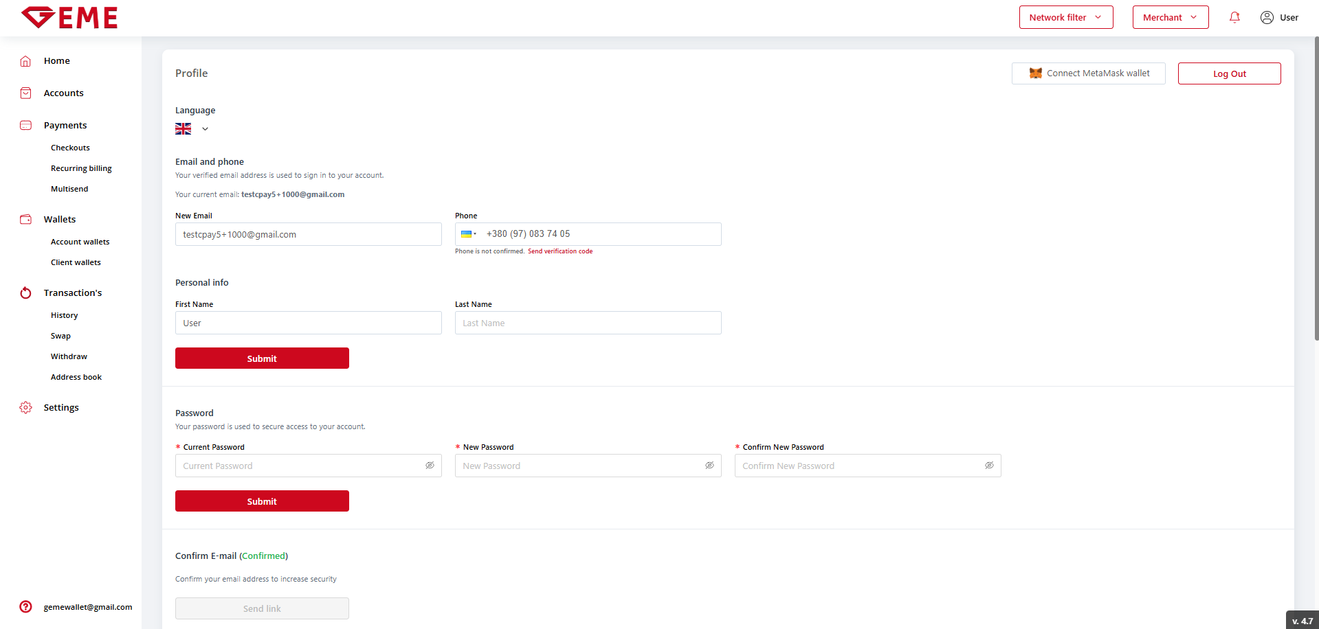 New Email - field for changing E-mail. The field displays the current E-mail, to change you need to confirm the E-mail under which the user is registered.