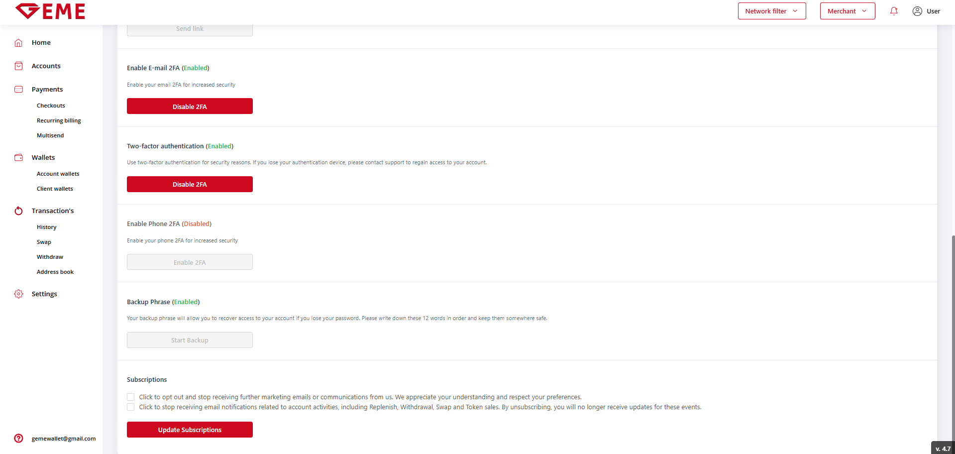 Enable/Disable E-mail 2FA - used to delete wallets, delete an account, view private keys, withdraw funds and login.
