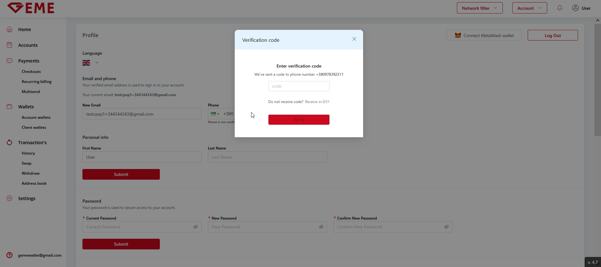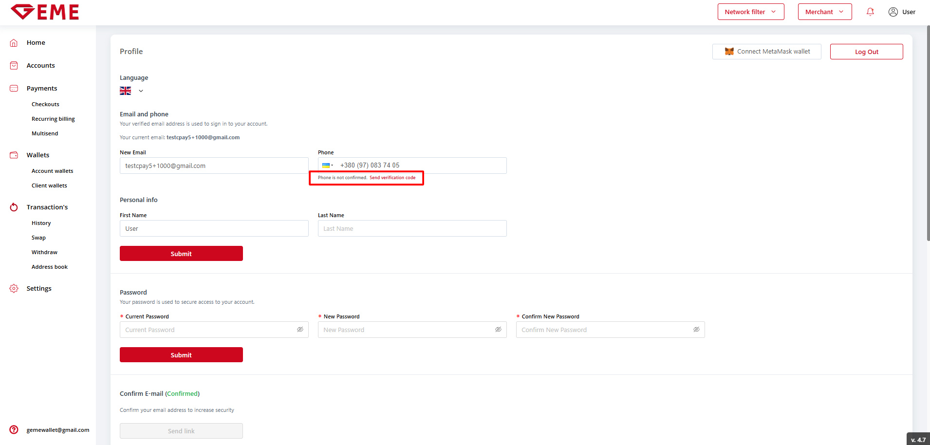 Phone - user phone. The field displays the current phone, to change you need to confirm the phone: