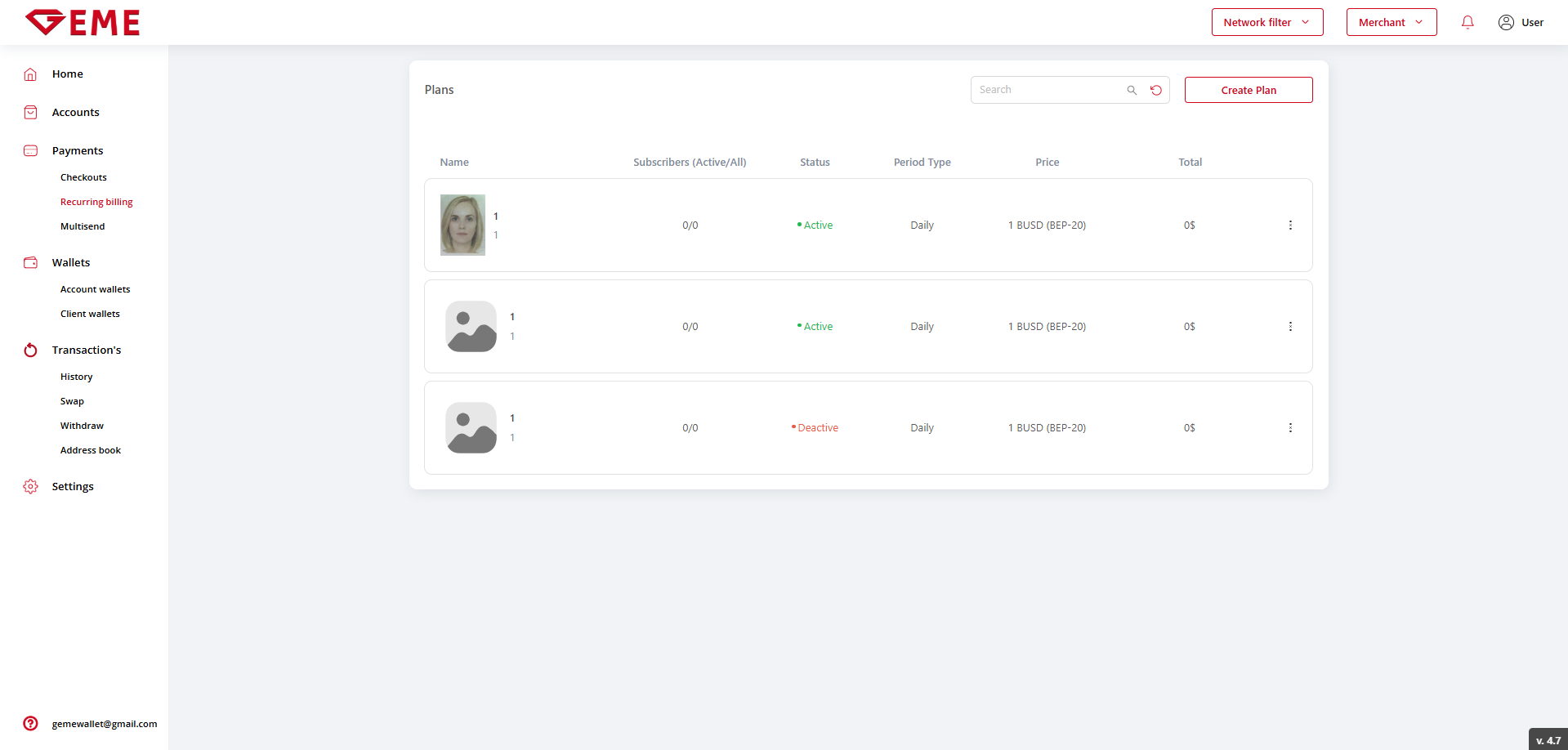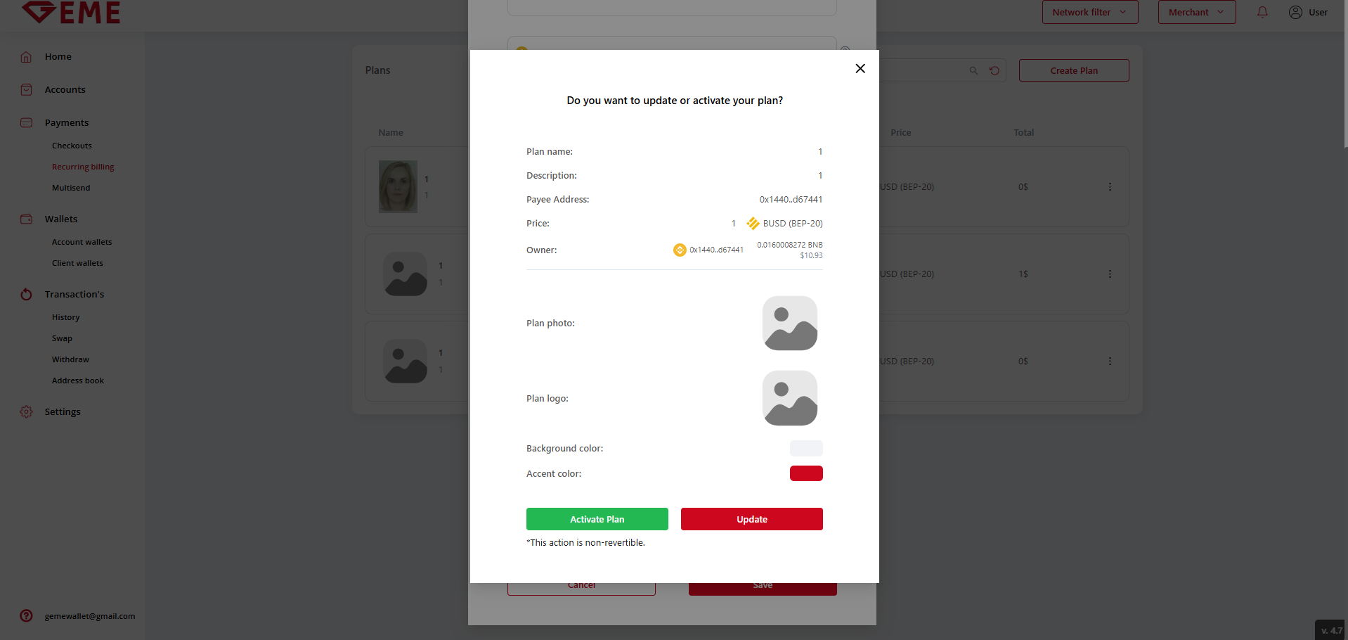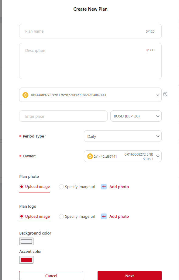 Payee address - the address to which funds for the subscription will be sent. Period type - the frequency of debiting funds for the subscription. Owner - the wallet that will publish the plan in the blockchain.