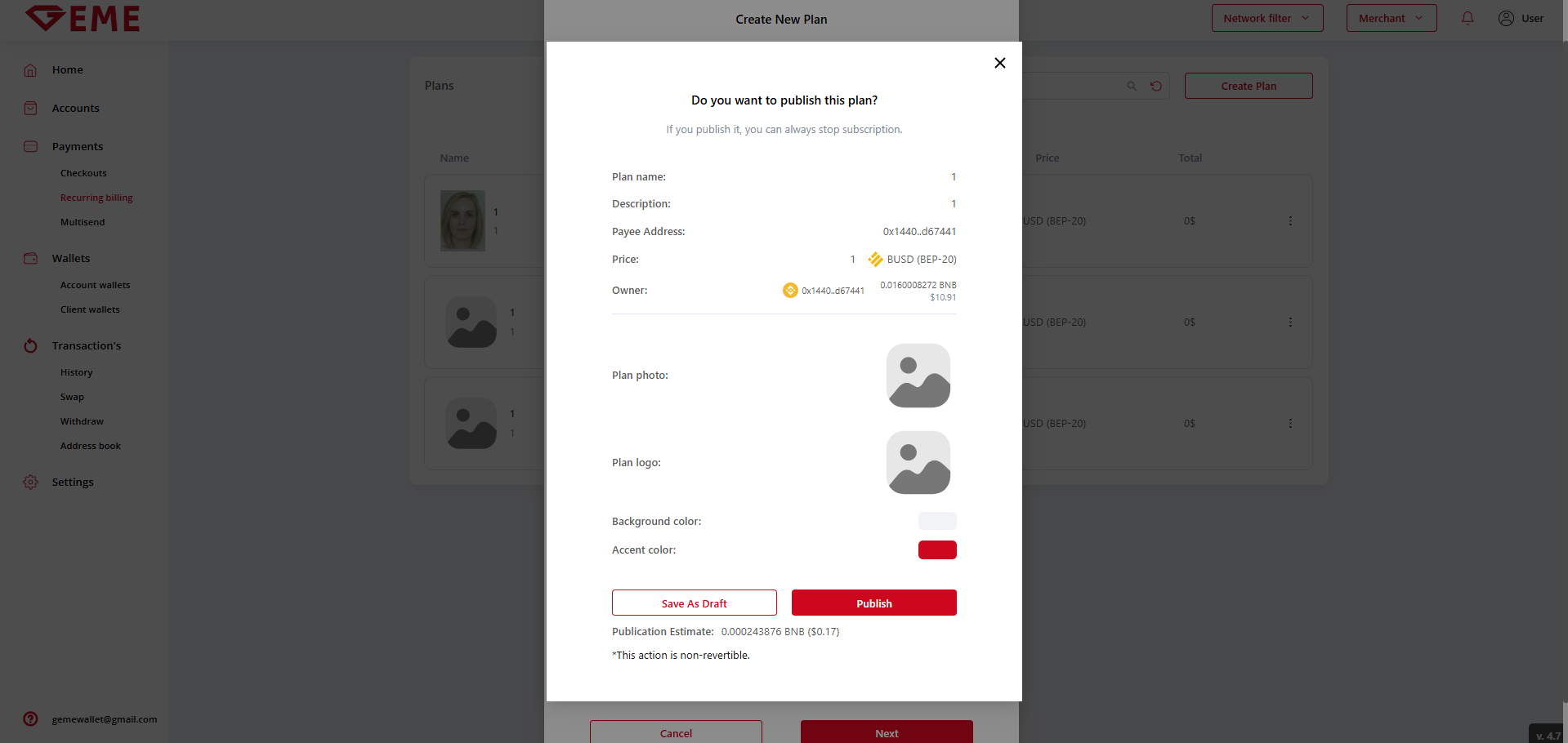 Save as Draft - do not publish the plan on the blockchain. Publish - publish the plan on the blockchain.