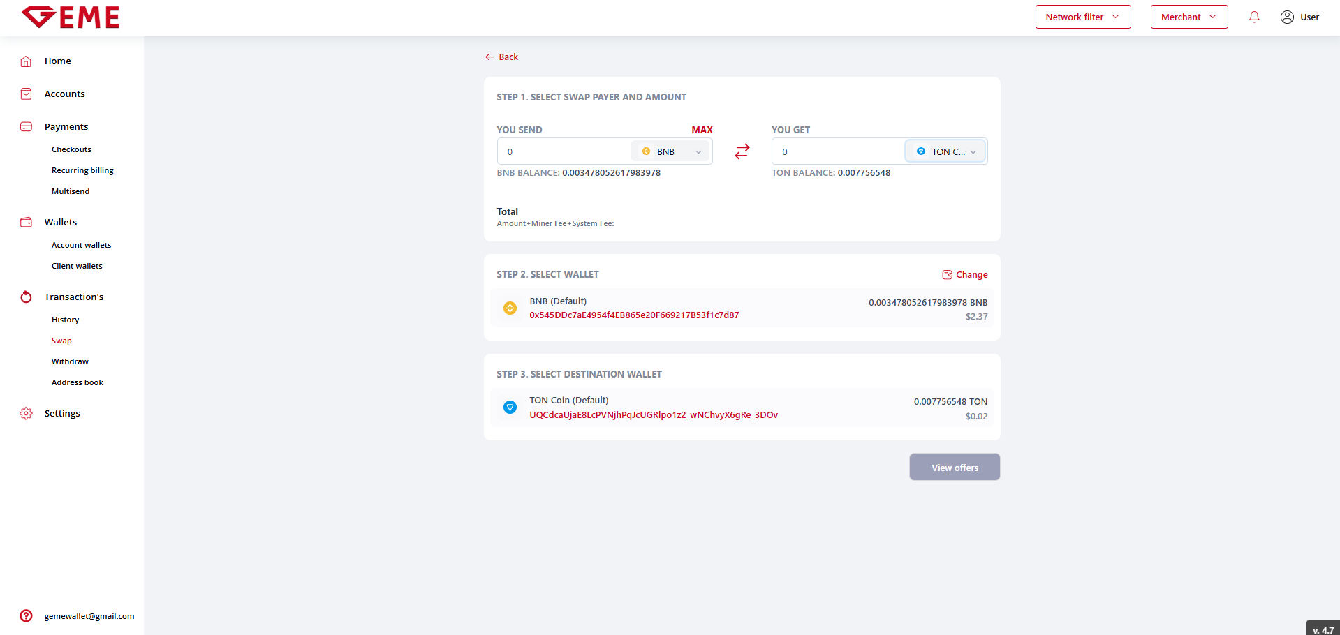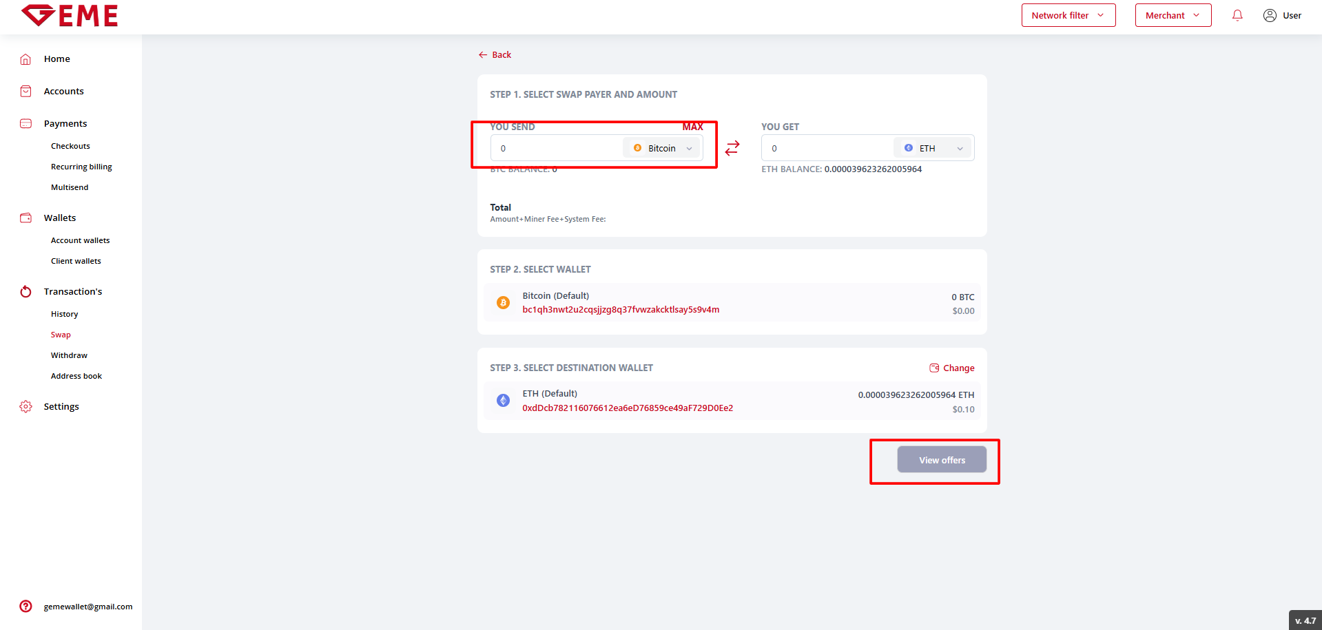 The "View offers" button is disabled if the exchange amount is not entered in the "YOU SEND" field at the first step, and wallets are not selected at the second and third steps.