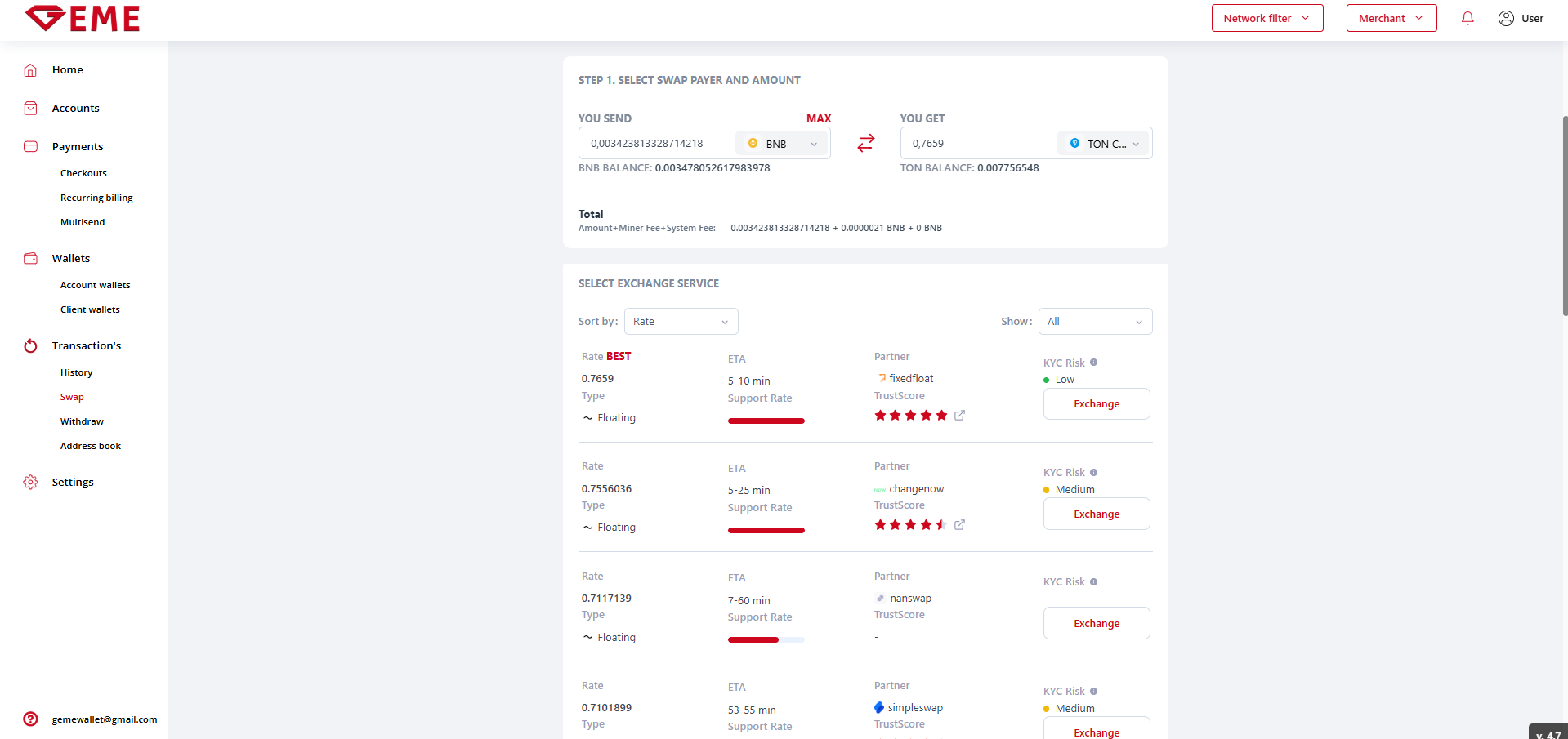 - Support Rate - the speed of the partner's response, in case of any problems associated with using the swap through him.