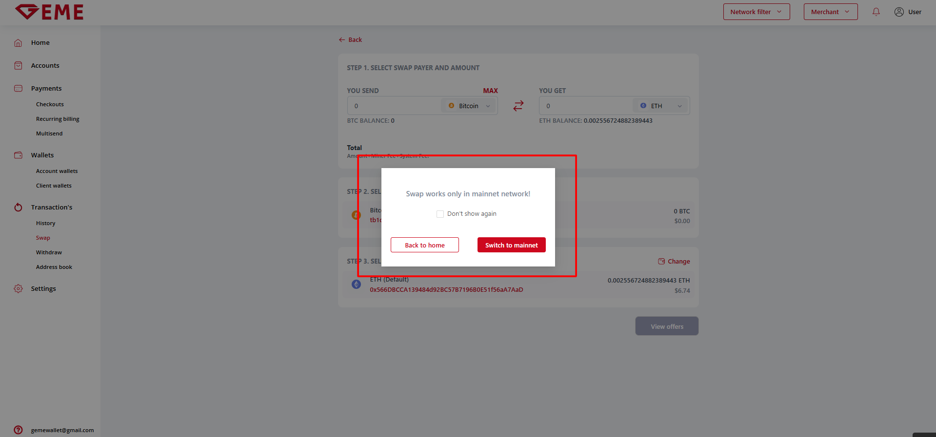 Swap works only in mainnet network! If you opened the swap creation on the testnet network, then a form will be displayed with a notification and a proposal to switch to the mainnet network.