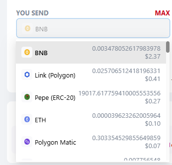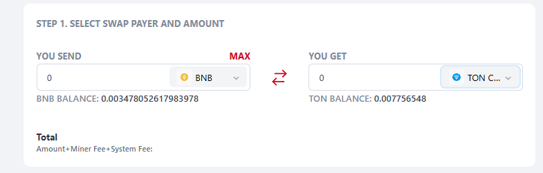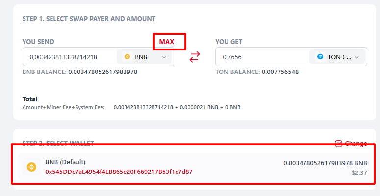 - After selecting any wallet in step 2, the "Max" button appears above the field, by clicking on which you will receive the maximum possible swap amount for this wallet. This amount takes into System Fee for tokens and Miner Fee and System Fee for currency.