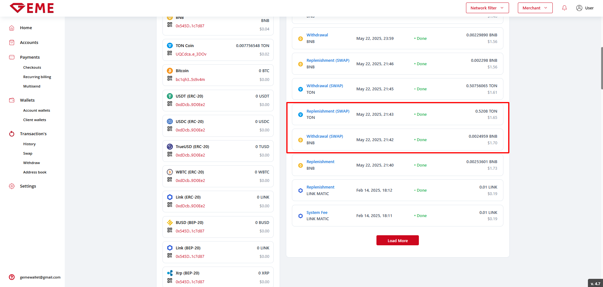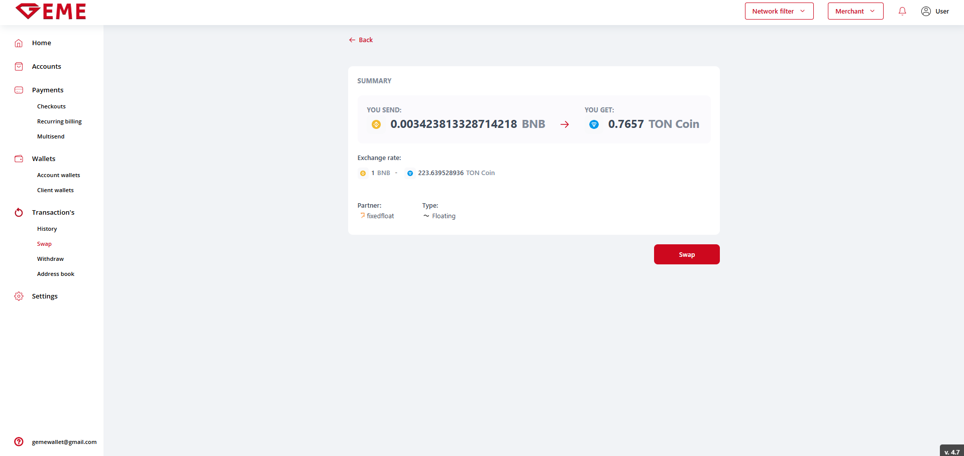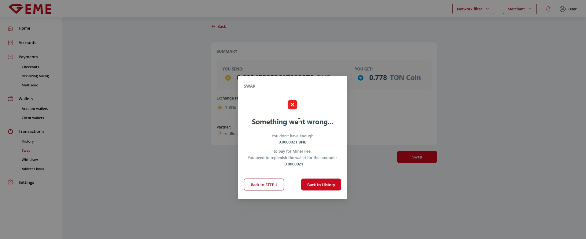 If the user tries to exchange more funds than he has on the account, he will receive an error message that indicates the maximum possible current swap amount and the amount by which he needs to replenish the balance in order to make the current swap. The message also contains the amount that is needed to pay Miner Fee.