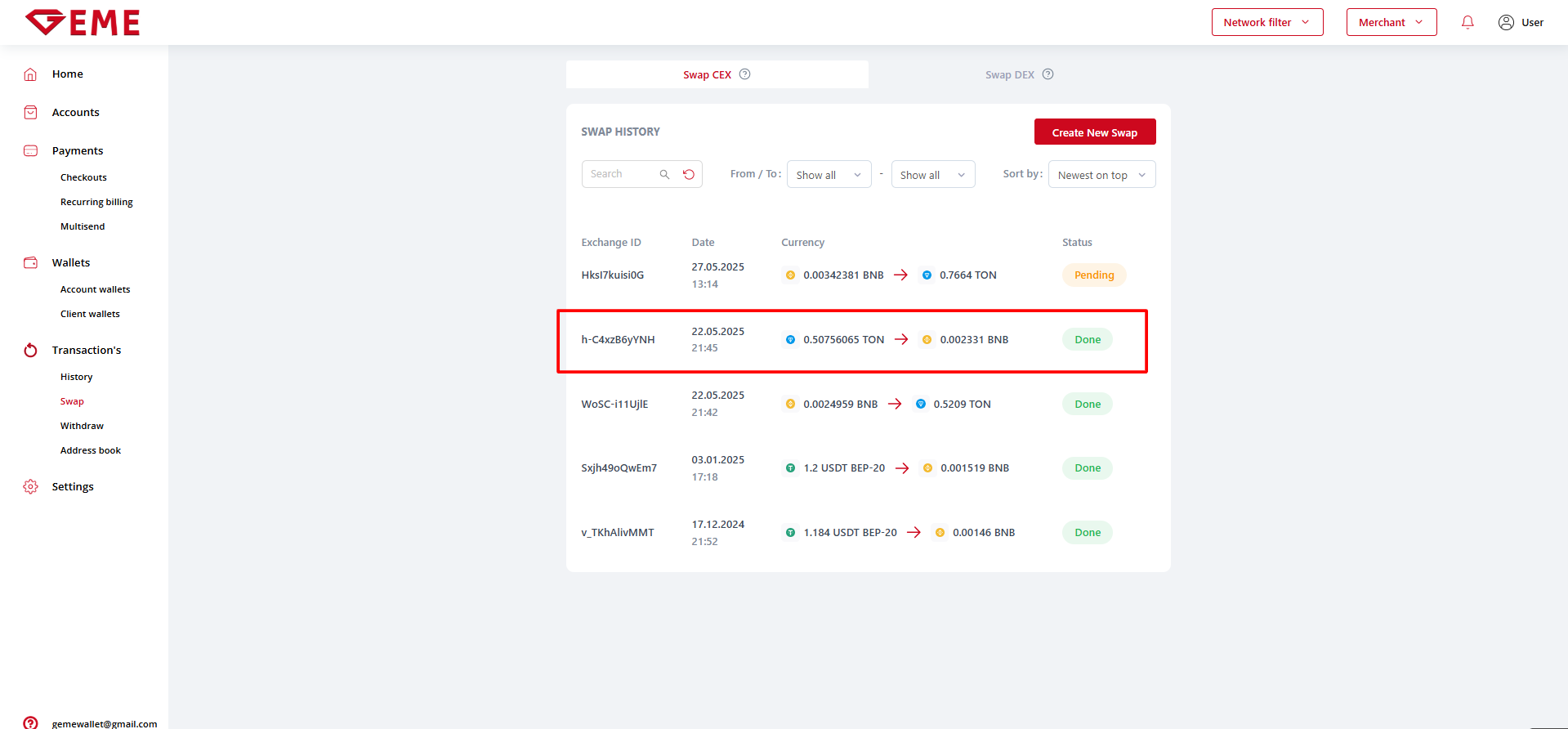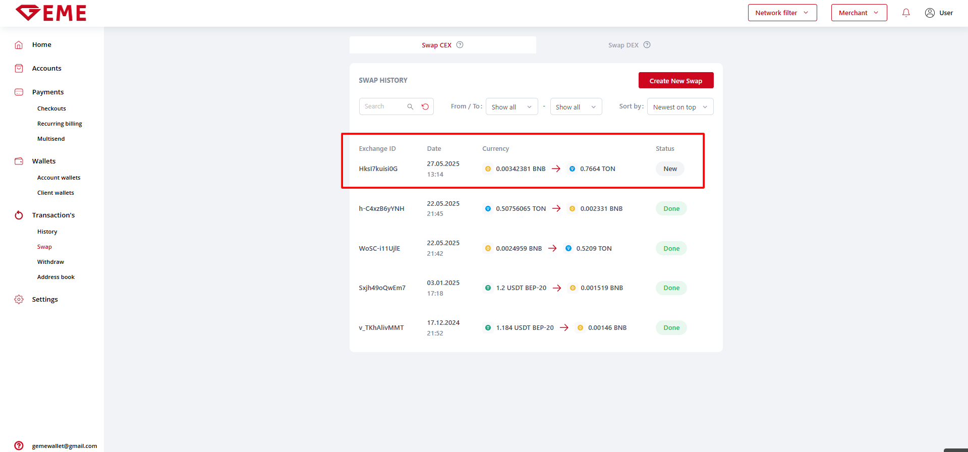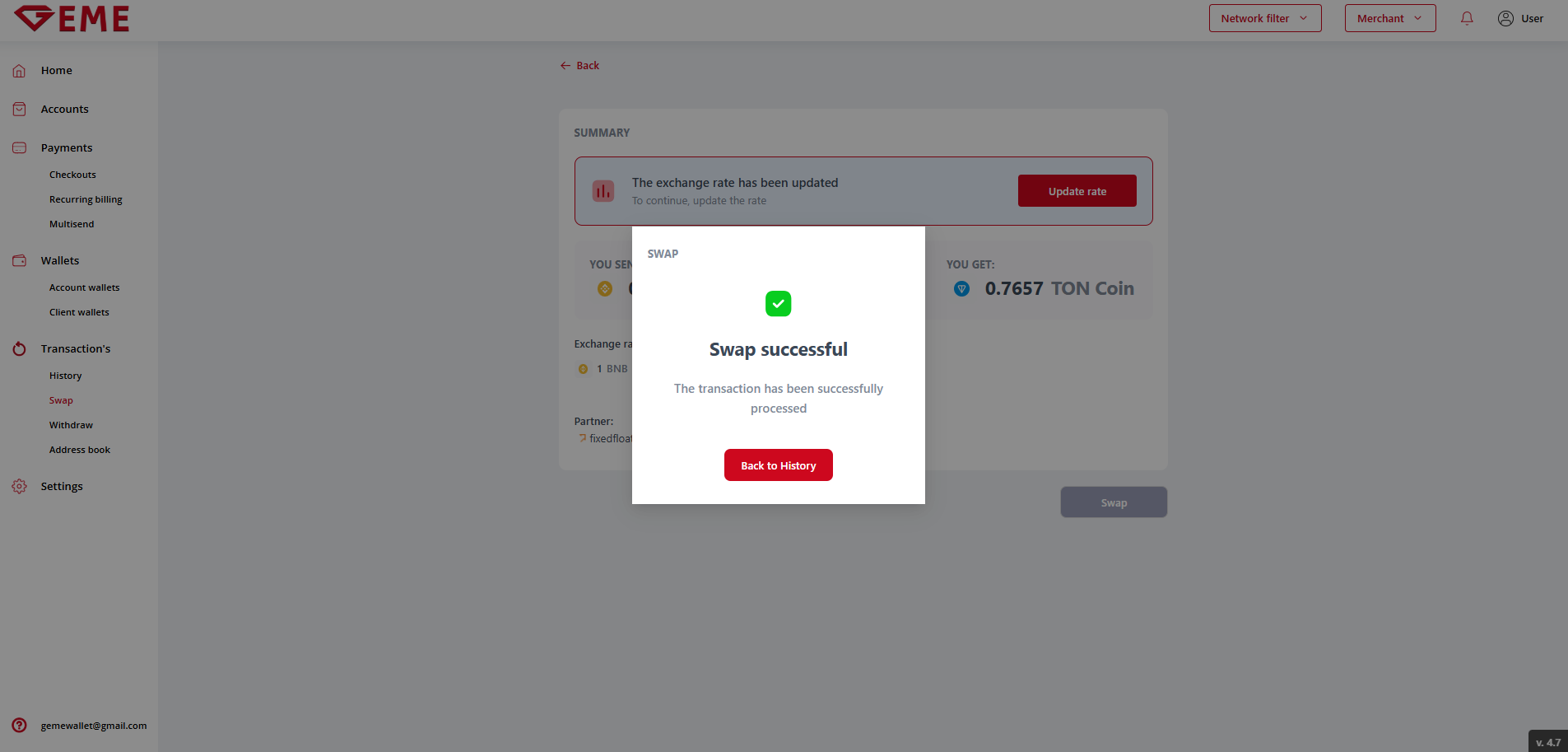 The button "Back to History" returns back to the history page, where the swap has already been created with the status "New".