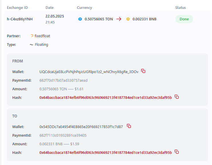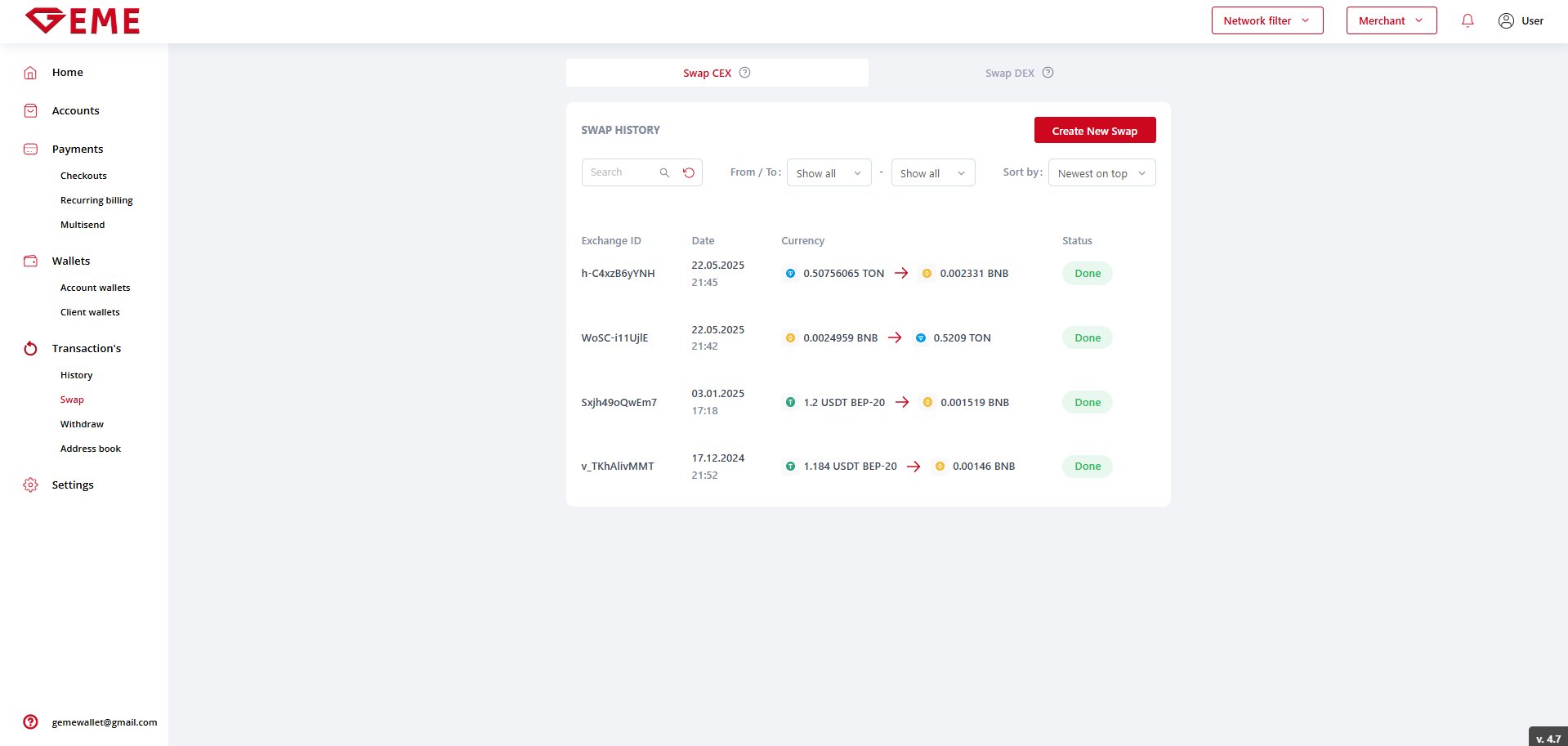 Search - you can search for swaps by Exchange ID, wallet and hash.