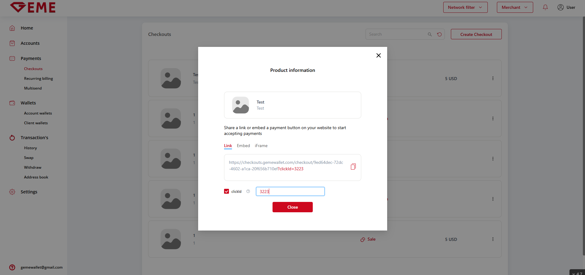 Step 3 - click on the created checkout and copy the link