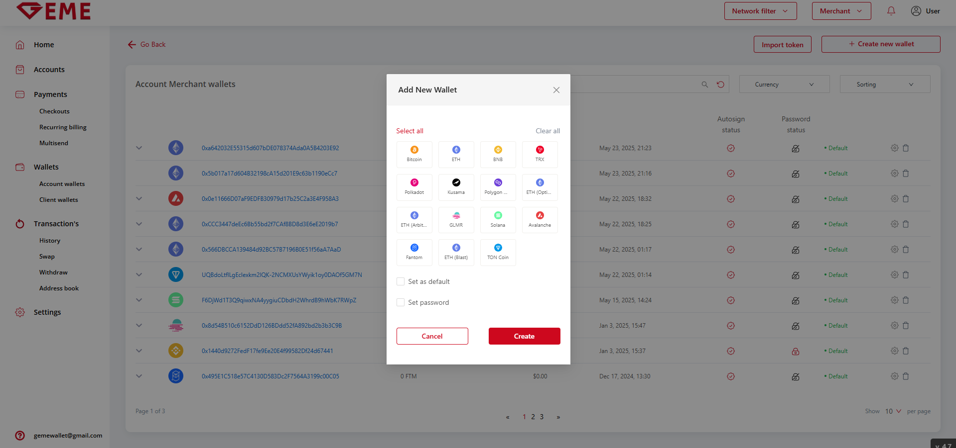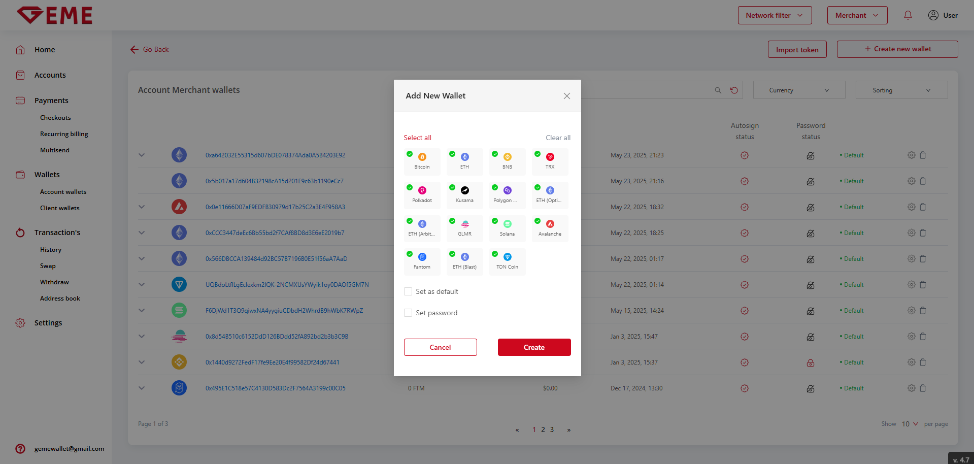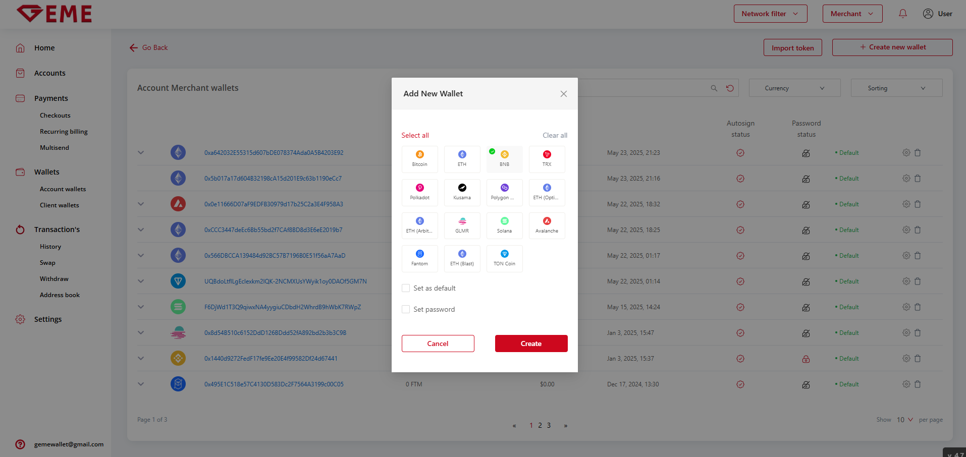 There are two types of wallets in the system: account wallets and client wallets. Account Wallet is a wallet that accepts funds from client wallets. Roughly speaking, this is the wallet of the business owner. You can create new merchant wallets or import the existing wallet. Client Wallet is a wallet that is created when a customer pays for a product or service. A business owner can create a client wallet himself and reset it to a client for replenishment. Also, such wallets are generated when paying for a checkout: donation,sale or sale token. Each wallet in the system is unique, you cannot create two identical wallets.