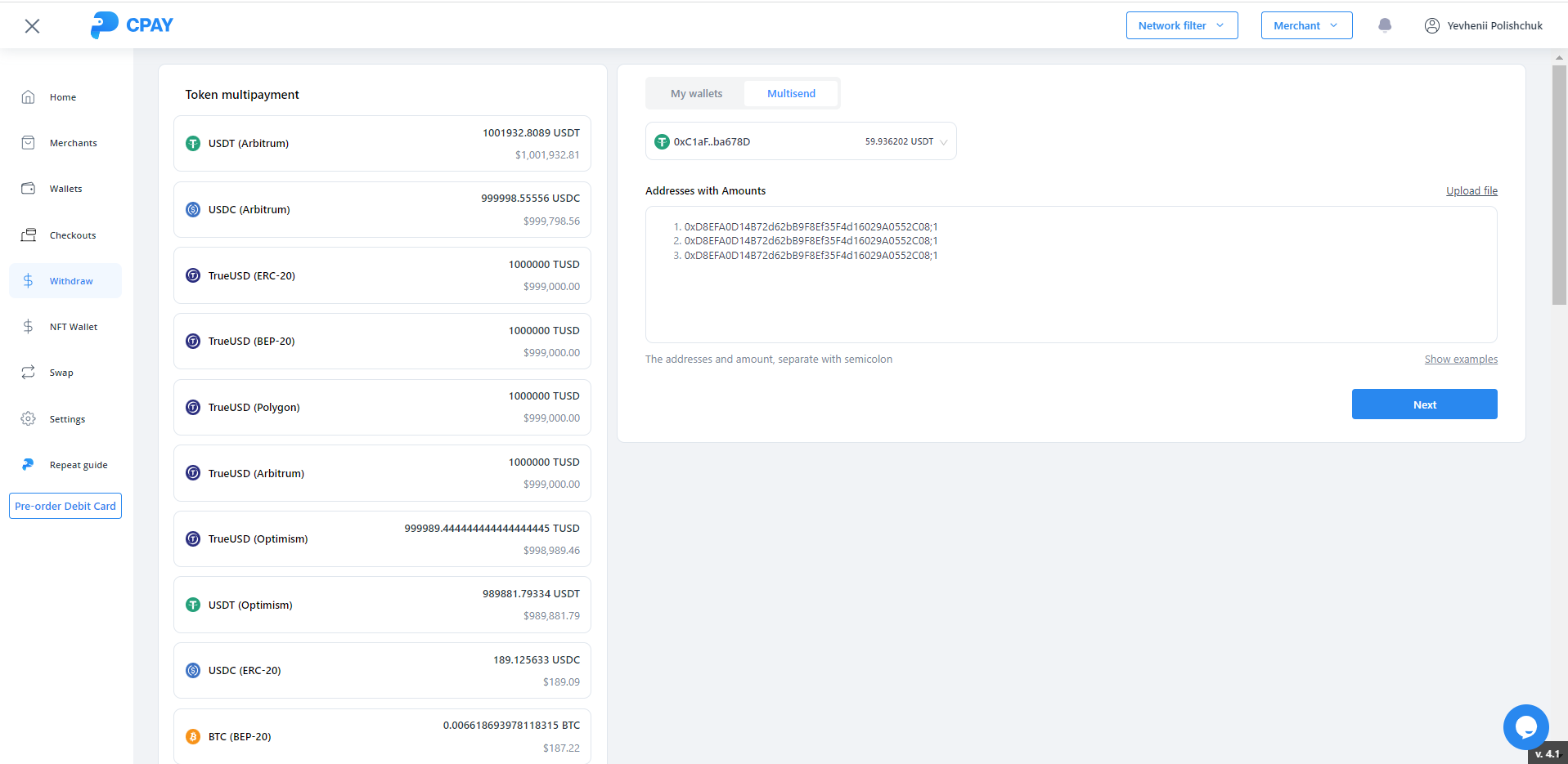 To perform a multisend you need to open this tab and select token, select wallet, input addresses and amounts: