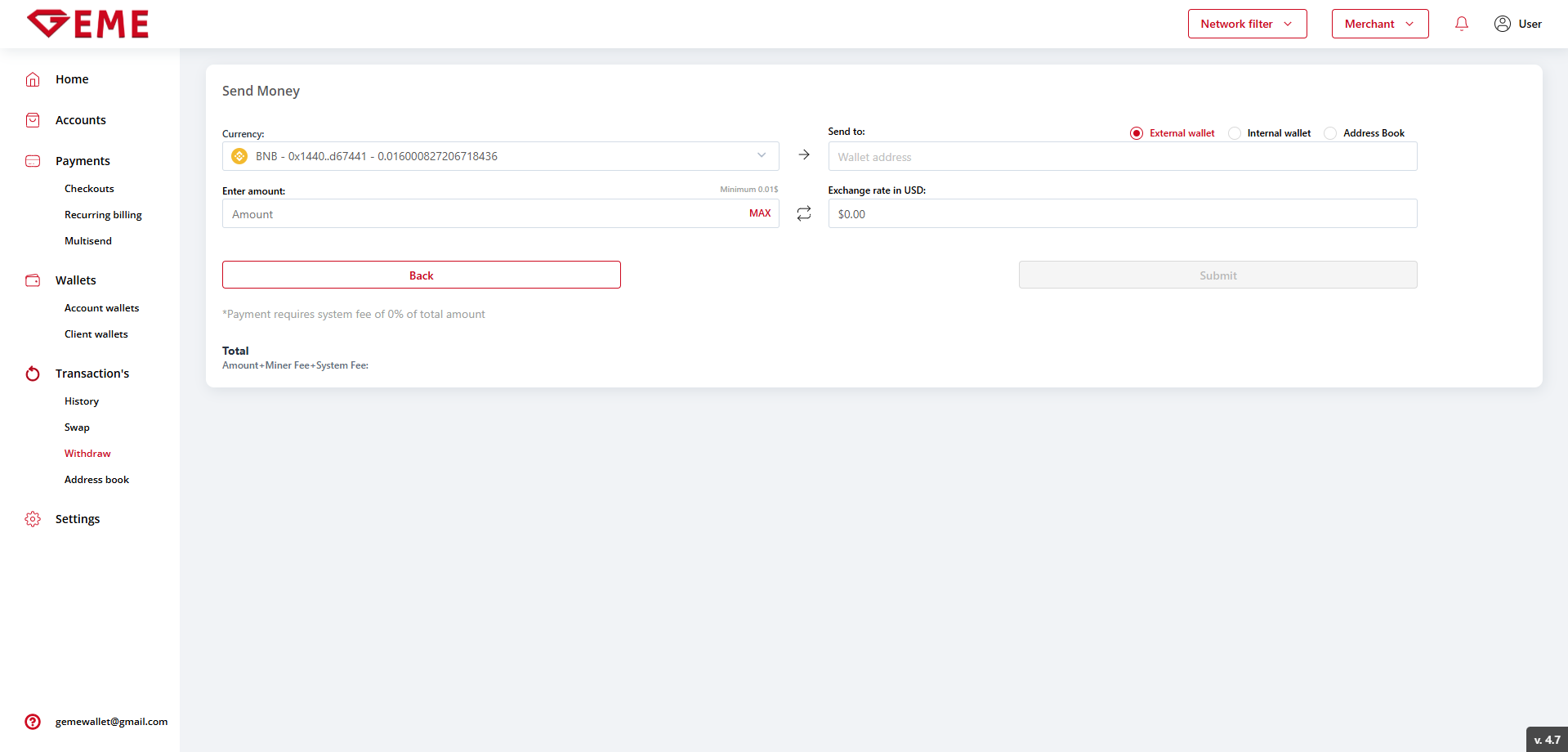 To start withdrawing funds, you need to select a wallet and click on the "Send" button, thereby opening the "Send Money" page.